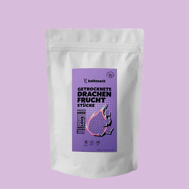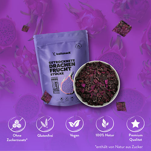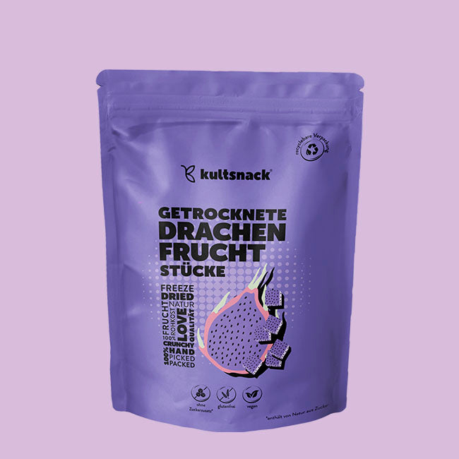 Exotisch, faszinierend und voller Farbenpracht – unsere getrockneten Drachenfrucht-Stücke von Kultsnack bringen dir ein Stück Tropenmagie ins Glas. Jede Frucht wird unter optimalen Bedingungen gereift, dann behutsam getrocknet, damit ihr intensives Aroma und leuchtendes Fruchtfleisch erhalten bleiben – ganz ohne künstliche Zusätze. Beim ersten Biss entfaltet sich ein mild süßer, leicht tropischer Geschmack mit einer zarten Textur, die langsam auf der Zunge zergeht. Ob pur als besonderer Snack, als Highlight in Smoothie-Bowls oder als außergewöhnliches Extra im Müsli – unsere Drachenfrucht-Stücke setzen farbliche und geschmackliche Akzente. Sie sind reich an Antioxidantien, Vitaminen und Ballaststoffen – ein edler Tropensnack, der nicht nur beeindruckt, sondern dir auch Gutes tut. 100 % naturbelassen, ohne Zuckerzusatz oder Konservierungsstoffe – so wie du es verdienst.