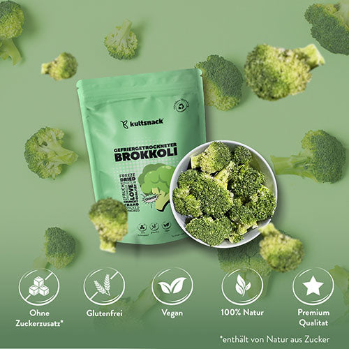 Gesund essen war noch nie so einfach – oder so lecker! Unser gefriergetrockneter Brokkoli von Kultsnack ist aromatisch, mild-herzhaft und 100 % natürlich. Durch die schonende Gefriertrocknung bleibt der volle Geschmack erhalten – ganz ohne Zusätze, dafür mit einem echten Plus an Vitaminen und Nährstoffen. Die knackig-luftige Konsistenz sorgt für extra Knabberspaß und macht Gemüse zum echten Genuss. Das mild-herzhafte Gemüse steckt voller Energie und unterstützt deine bewusste, unkomplizierte Ernährung. Und das Beste: Gemüse auch unterwegs oder zwischendurch snacken war noch nie so einfach – und gleichzeitig so lecker. Ob pur, in Salaten, Soßen, Dips oder warmen Gerichten wie Nudeln, Reis oder Aufläufen – dieser Brokkoli ist vielseitig, leicht und einfach gut für dich.