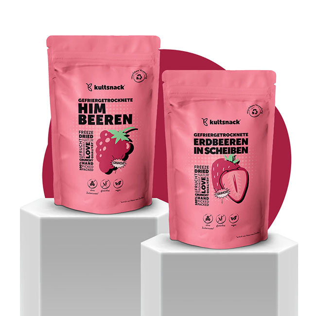 Du liebst unsere gefriergetrockneten Erdbeeren und Himbeeren? Dann ist dieses Probierpaket mit den praktischen, wieder verschließbaren Vorteilspackungen genau das Richtige für dich. Nicht zu viel und nicht zu wenig, genau die richtige Größe um dich hin und wieder lecker und bewusst zu snacken. Und dir dein Frühstück in wenigen Sekunden lecker und nährstoffreich zuzubereiten. Genieße beide Beerensorten pur, oder mische sie für die volle Beerenpower.