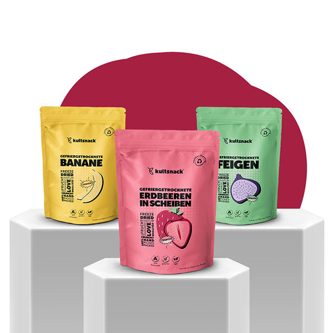 Mit dem Probierpaket 3 kannst du unser beliebtes Trio aus süßen gefriergetrockneten Feigen, Banane und Erdbeerscheiben in den praktischen Snack Packs für unter 20,00 € testen. Dich interessiert schon lange, wie gefriergetrocknete Früchte eigentlich schmecken, aber du bist dir unsicher und hast dich nie an die größeren Packungen getraut? Dann ist dieses Bundle genau richtig für dich. Die gefriergetrockneten Früchte in diesem Set schmecken fast jedem. Sie lassen sich super individuell einsetzen und untereinander mischen. Perfekt für unterwegs, zwischendurch, in Müslis, Bowls und Smoothies. Wann immer es schnell gehen muss, die Zeit für frisches Obst fehlt und du es dir einfach machen willst.